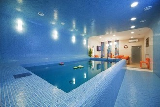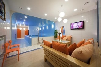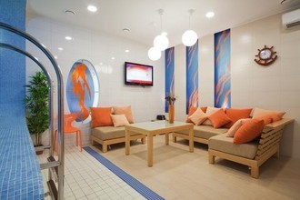 Пространство сауны оформлено в приятной персиково-голубой расцветке. Аквазона отделана мозаичной плиткой, а в зоне отдыха есть мягкий диван, на котором приятно расслабиться и выпить чаю.
