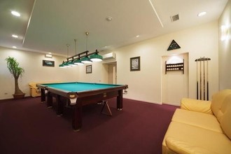 Из аквазоны с сауной вы можете переместиться в зону отдыха и сыграть в бильярд. Прямо в центре помещения оборудован шикарный бильярдный стол. Пока вы разыгрываете партию, другие гости могут отдохнуть в диванной зоне и исполнить любимые хиты в караоке.